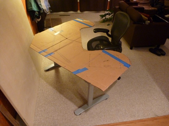 Testing leg placement using the cardboard version of my desk. I only wanted one set of legs so it was tricky figuring out the perfect placement given the odd shape. My final result was a diagonal that gave the most support to the left and back where the laptop would sit and monitor arms would be mounted.